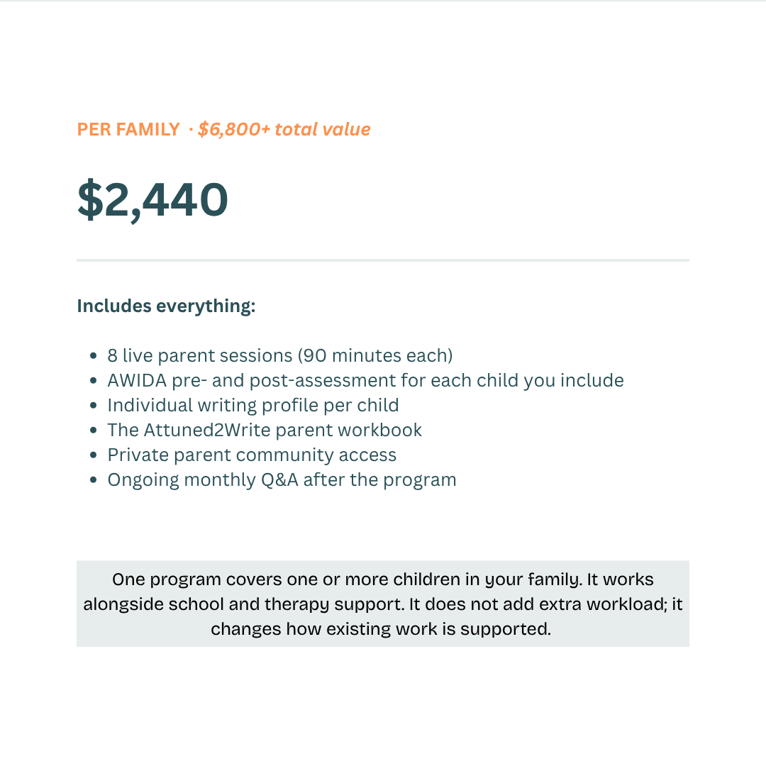 The Attuned2Write Integrated Writing and Developmental Assessment. Identifies exactly where your child's writing is breaking down across thinking, language, physical fluency, and emotional readiness, then maps that directly to the step that needs focus.